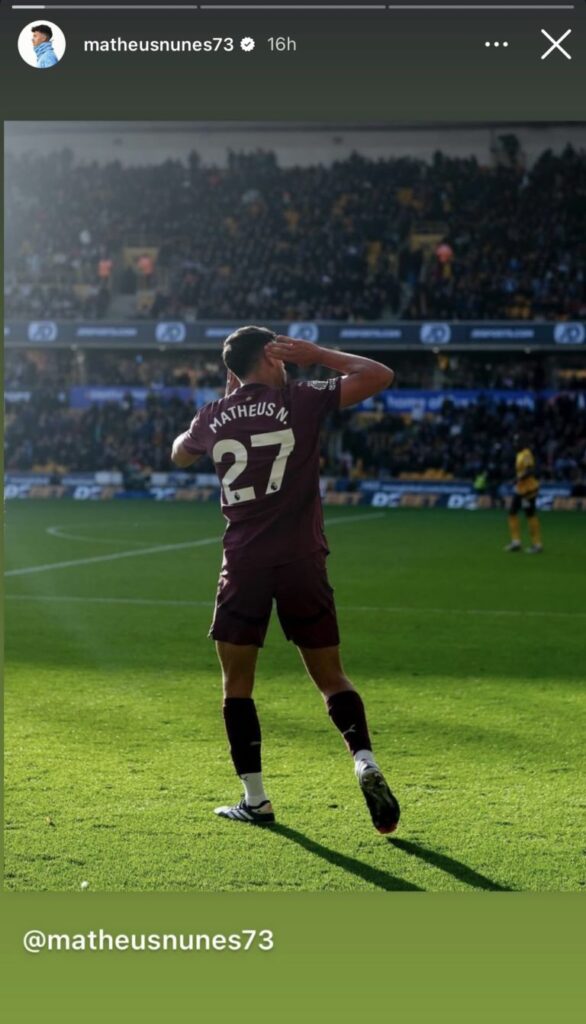 Nunes took to Instagram to celebrate his side’s late win, captioning a photo of himself cupping his ears by saying, “What a WIN! What a feeling to win this game! C’mon Citeh.”