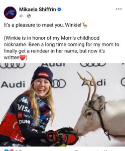 Following the medals ceremony, Shiffrin was introduced to her new reindeer, which she dubbed “Winkie” in tribute to her mother and coach, Eileen Shiffrin. “It’s been a long time coming for my mom to finally get a reindeer in her name, but now it’s written ❤️,” Shiffrin shared on social media.