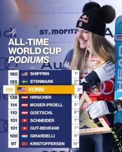 With this triumph – her 83rd career World Cup victory and 44th in downhill – Vonn added her 139th podium finish, surpassing Marcel Hirscher and moving ahead of the Austrian great. Now, only Mikaela Shiffrin and the legendary Ingemar Stenmark stand above her on the historic leaderboard.