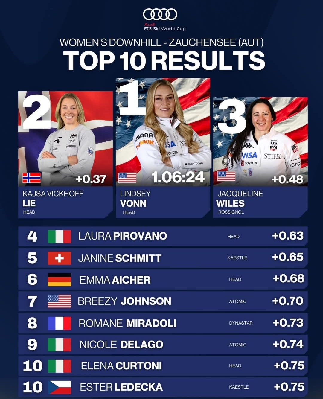 • Top 10 Results: Women’s Downhill at Zauchensee World Cup – Lindsey Vonn Claims Historic 84th Victory