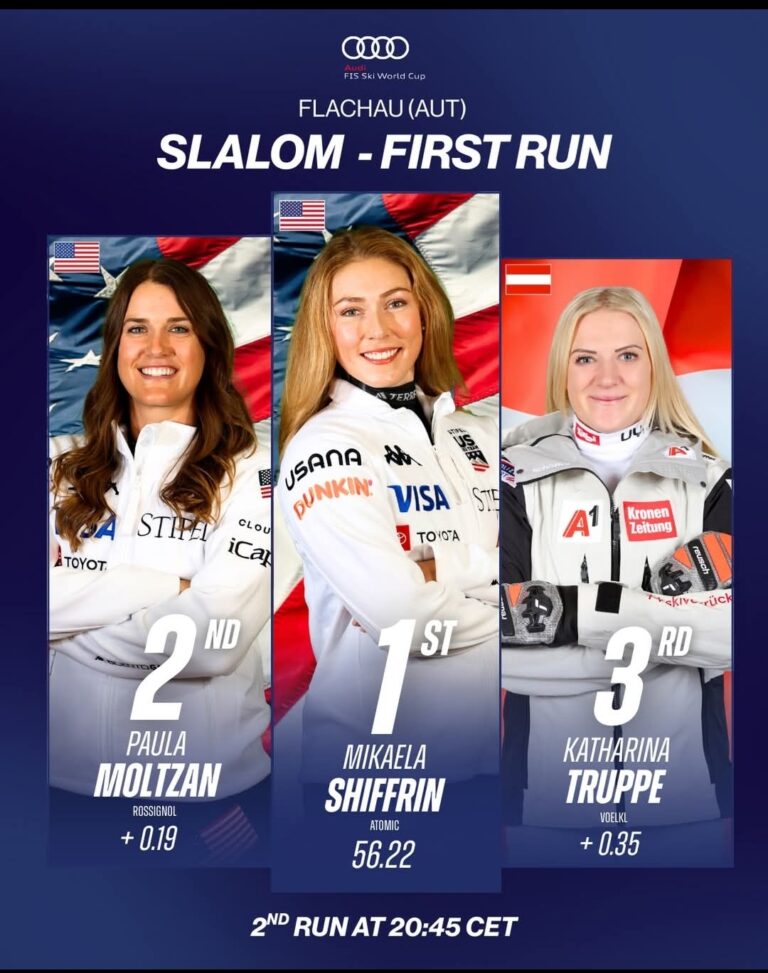 The iconic Hermann Maier floodlit course in Flachau lit up with red, white, and blue as Mikaela Shiffrin and teammate Paula Moltzan delivered a commanding American 1-2 finish after the opening run of Tuesday’s FIS Alpine World Cup women’s slalom on January 13, 2026.
