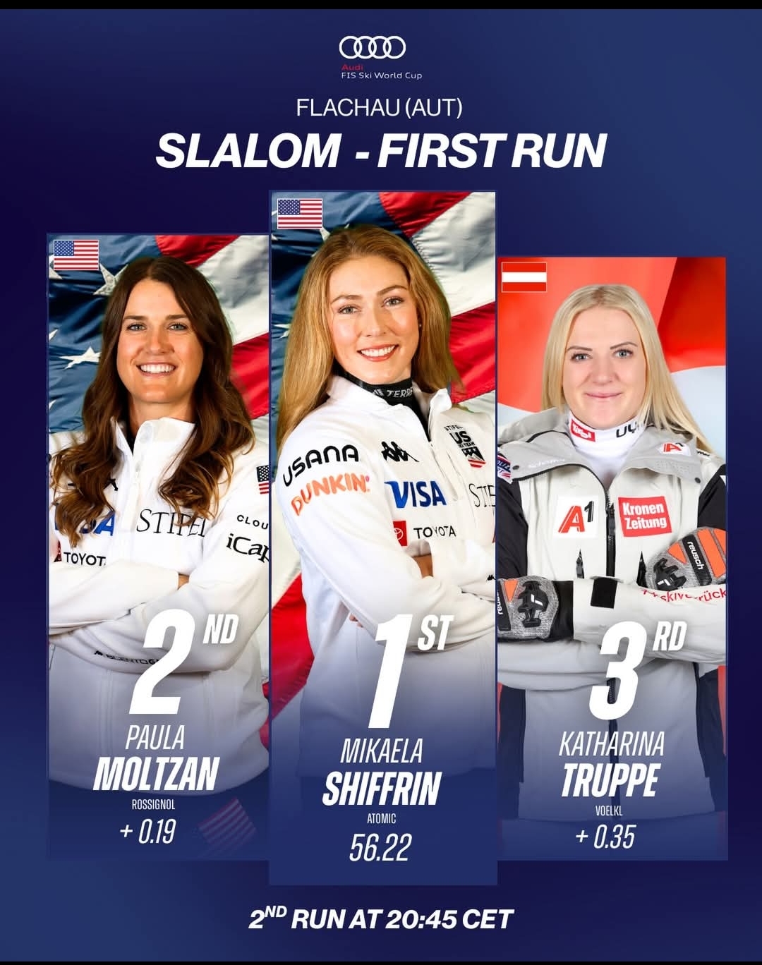 The electric night race atmosphere in Flachau sets the stage for a tense second run at 20:45 CET (2:45 p.m. ET), where Shiffrin could clinch the season slalom crystal globe with a win (if Rast finishes outside the top 14). Moltzan aims to convert her strong start into a breakthrough victory, while Truppe and Rast lurk as serious threats on home snow and in familiar conditions.