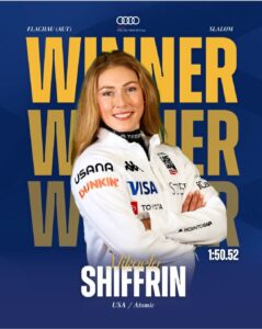 The race unfolded under electric atmosphere typical of the Flachau night event, with fans lining the illuminated course. Shiffrin showcased her signature precision and edge control, building a solid advantage after the first run and maintaining composure in the decisive second leg.