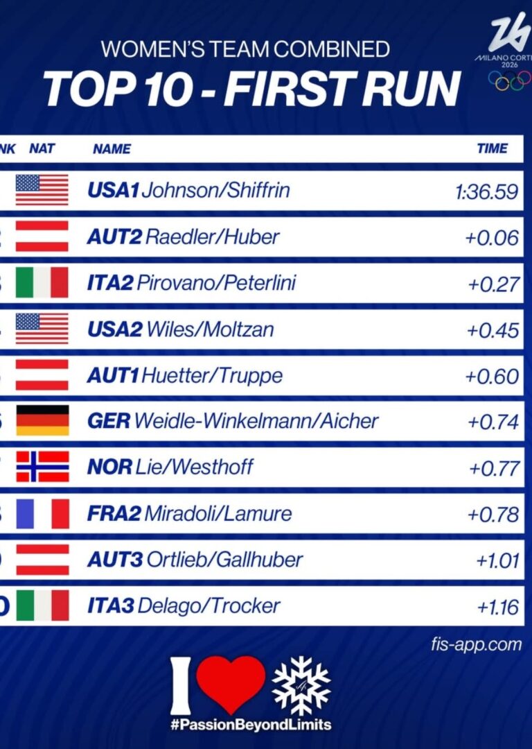 The Women’s Team Combined at the Milano Cortina 2026 Winter Olympics just got electric after the downhill leg, with USA 1 (Breezy Johnson downhill + Mikaela Shiffrin slalom) blasting to the top of the leaderboard!