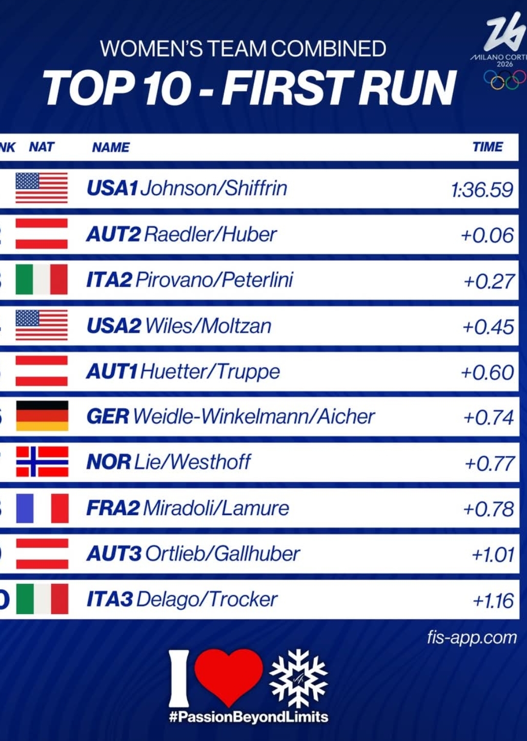Here’s the 🔥 top 10 after downhill (times are downhill splits; final combined decided post-slalom):