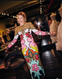 Captured mid-stride in what appears to be a high-end atelier or fashion event space—surrounded by mannequins, dramatic lighting, and creative energy—Shiffrin flashes a joyful, eyes-closed smile while striking a playful pose with arms outstretched. Her signature blonde hair cascades loosely, and subtle makeup with bold red lips completes the radiant look.