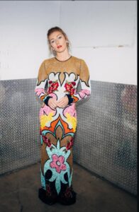 The multi-Olympic gold medalist and all-time World Cup wins record holder recently stepped out in a show-stopping long-sleeve gown featuring a glittering gold base adorned with vibrant, oversized floral motifs in pink, white, turquoise, and pops of orange and yellow. The intricate sequin work creates a playful yet sophisticated explosion of color and texture, complete with whimsical heart-shaped accents and bold patterns that scream confidence and creativity.