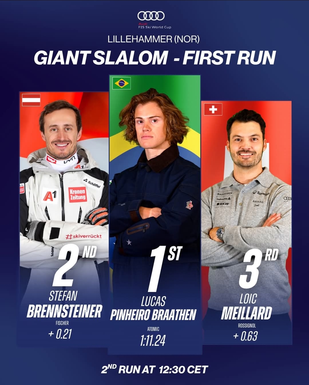 Second run starts soon. Can Braathen hold his nerve and make history? Or will Brennsteiner or Meillard pull off a miracle comeback?