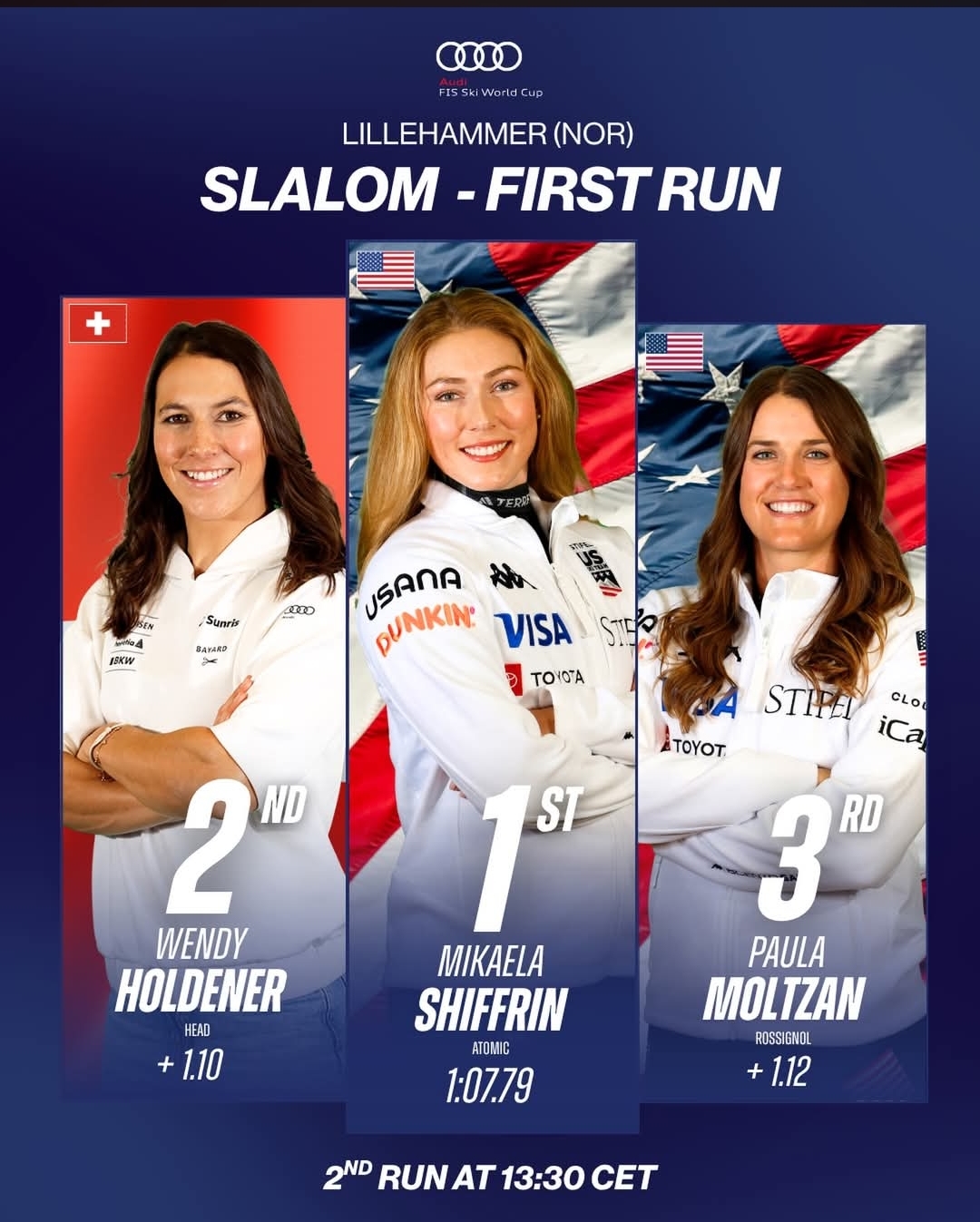 Shiffrin, already the undisputed queen of slalom with eight wins from nine races this season, delivered a clean, aggressive performance on the Norwegian hill to open a commanding gap. Close behind are Switzerland’s veteran technician Wendy Holdener at +1.10 and American teammate Paula Moltzan at +1.12, keeping the door slightly ajar for drama in the second run.c19990